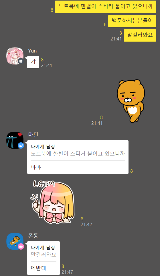 우테코 첫주에 내 노트북에 붙어있는 한별이 스티커를 보고 먼저 말을 걸어주었었고 그렇게 친해졌다.