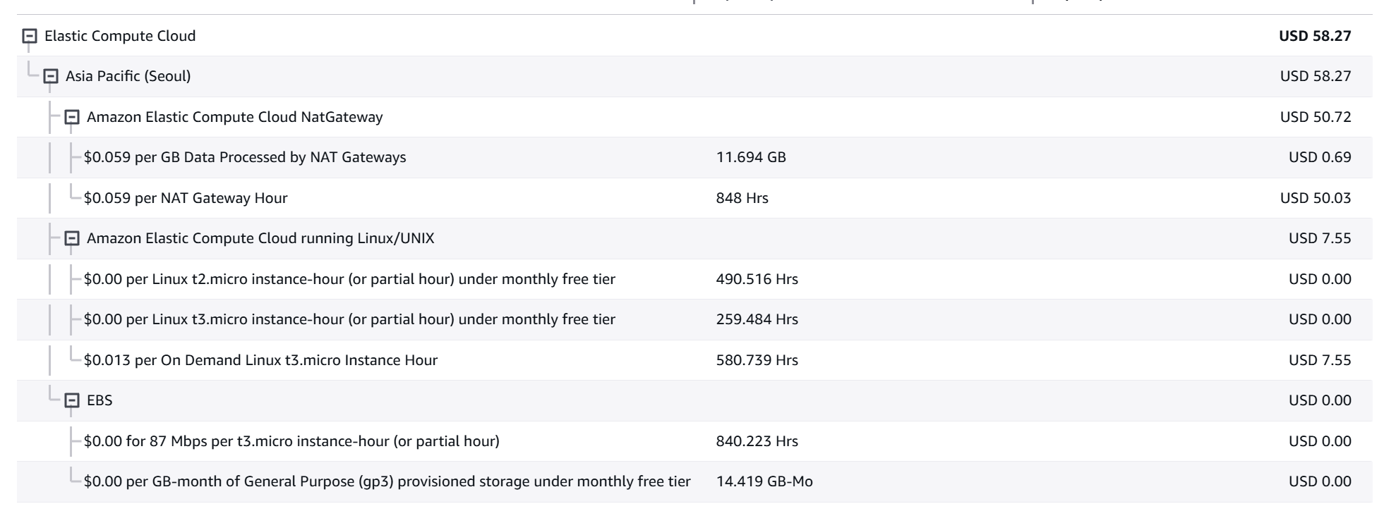 예상외로 꽤 많이 나와서 뭔가 조치를 취해야 했다. 우선 다중 서버로 운영되던 인스턴스들을 하나만 남기고 전부 다운시켜 단일 서버로 변경하였다. 하지만 명세서를 살펴보니 원인은 인스턴스의 갯수가 아닌 다른 곳에 있었다.