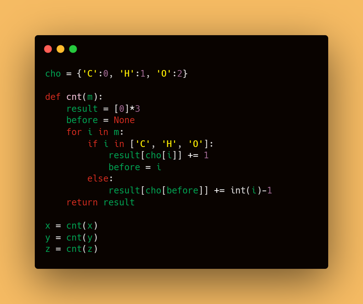 result๋ [0,0,0]์์ผ๋ก ๋ง๋ค์ด์ง๋๋ฐ result[0]์ C์ ๊ฐฏ์, result[1]์ H์ ๊ฐฏ์ ๊ทธ๋ฆฌ๊ณ result[2]์ O์ ๊ฐฏ์๊ฐ ๋ด๊ธธ ์์ ์ด๋ค.